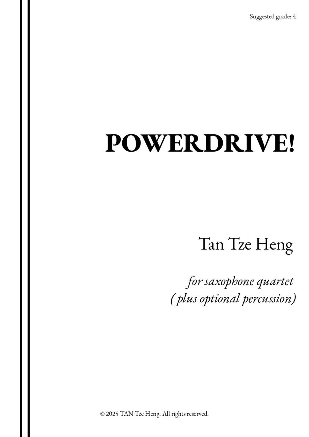 This is the purchase page for the full score and part scores of the piece, "Powerdrive!", written for a saxophone quartet (AATB, with an optional drums part).